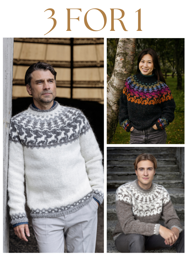 Í takmarkaðan tíma geturðu fengið þrjú falleg hreindýramunstur í Léttlopi, öll hönnuð af Védísi Jónsdóttur, á verði eins. Munstrin eru úr bókinni Vetrartíð, Lopi 44.
