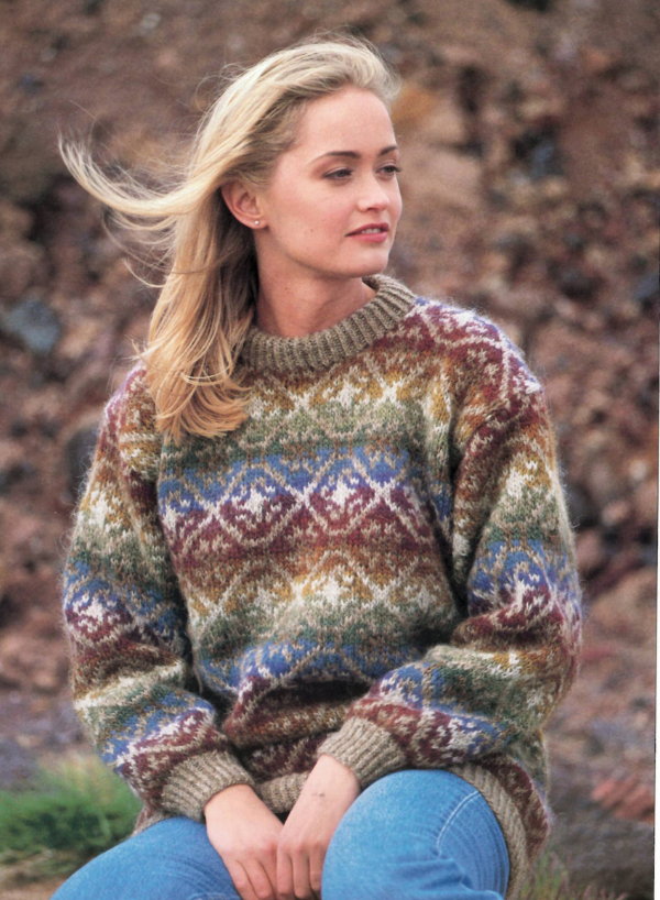 The Riddari pattern is a favorite choice for knitting this sweater. It is available in two color options, green and brown, both made from Icelandic Léttlopi yarn. The design was created by Védís Jónsdóttir.